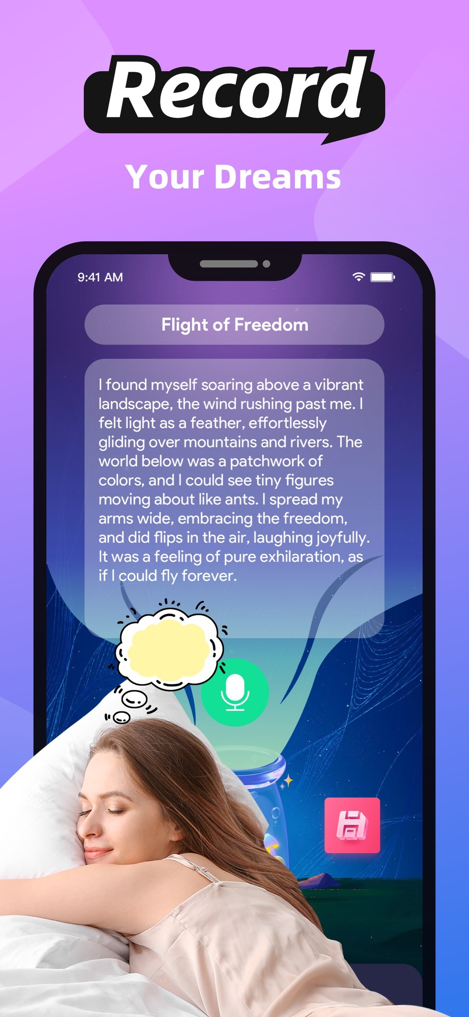 Users can conveniently record their dreams, whether in text or images, which can be saved and shared.